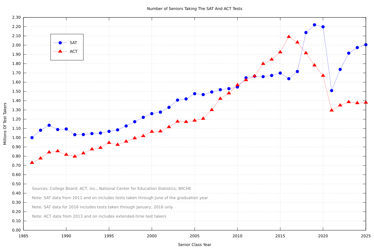In 2024, of course, the SAT went fully digital; the following year, the ACT began offering a digital option, too. We don’t yet have enough data to conclude one way or the other whether this transformation from paper- to computer-based will affect the Digital SAT’s popularity versus the ACT’s.